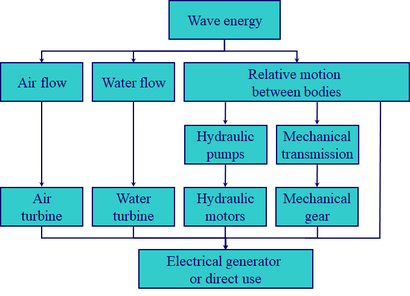 Wave energy converters (WECs) are generally categorized by the method, by location and by the power take-off system. Locations are shoreline, nearshore and offshore. Types of power take-off include: hydraulic ram, elastomeric hose pump, pump-to-shore, hydroelectric turbine, air turbine,[15] and linear electrical generator.