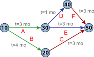 PERT chart for a project with five milestones (10 through 50) and six activities (A through F). The project has two critical paths: activities B and C, or A, D, and F – giving a minimum project time of 7 months with fast tracking. Activity E is sub-critical, and has a float of 1 month.