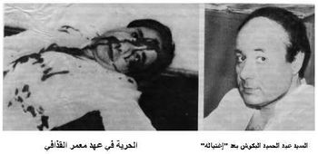 "قامت اليوم مفارز اللجان الثورية بتصفية ال....... وأن ذراع اللجان الثورية طويلة وستصل لكل من ..........أينما كان.......ووو إلخ". أما محطة تلفزيون النظام فقد روى من شاهدها حرص المخرج بعرض وجه "الضحية" على كامل مساحة الشاشة والذي كانت مخضبة بالدماء.