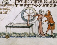 The spinning wheel replaced the earlier method of hand spinning with a spindle. The first stage in mechanizing the process was mounting the spindle horizontally so it could be rotated by a cord encircling a large, hand-driven wheel. The great wheel is an example of this type, where the fibre is held in the left hand and the wheel slowly turned with the right. Holding the fibre at a slight angle to the spindle produced the necessary twist.[17] The spun yarn was then wound onto the spindle by moving it so as to form a right angle with the spindle. This type of wheel, while known in Europe by the 14th century, was not in general use until later. The construction of the Great Wheel made it very good at creating long drawn soft fuzzy wools, but very difficult to create the strong smooth yarns needed to create warp for weaving.[18] Spinning wheels ultimately did not develop the capability to spin a variety of yarns until the beginning of the 19th century and the mechanization of spinning.