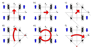 - Running all four wheels in the same direction at the same speed will result in a forward/backward movement, as the longitudinal force vectors add up but the transverse vectors cancel each other out;