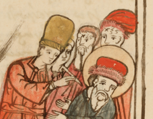The passage is also seen as an antithetical parallelism to the Jewish institution of tefillin—Hebrew Bible texts worn bound to the arm and the forehead during daily prayer. Instead of binding their allegiance to God to their arm and head, the place is instead taken with people's allegiance to the beast.[33]