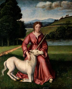 Medieval bestiaries stated that the only way to capture or tame a unicorn was by way of using a virgin as a lure, due to her implied purity.[2] The topic is popular in Renaissance paintings.