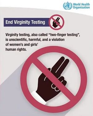 Some cultures require proof of a bride's virginity before her marriage. This has traditionally been tested by inspection for an "intact" hymen,[38] or by a "proof of blood", which refers to vaginal bleeding wrongly believed to be caused by the tearing of the hymen after the first sanctioned sexual contact.[39][40][41][42] Coerced medical virginity tests are practiced in many regions of the world, but are today condemned as a form of abuse of women. According to the World Health Organization (WHO): "Sexual violence encompasses a wide range of acts including (...) violent acts against the sexual integrity of women, including female genital mutilation and obligatory inspections for virginity".[43]