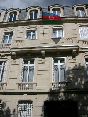 Flag of Azerbaijan over the building of the Azerbaijani embassy in Paris