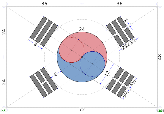 The width and height are in the ratio of 3 to 2. There are five sections on the flag, the taegeuk and the four groups of bars. The diameter of the circle is half of the height. The top of the taegeuk should be red and the bottom of the taegeuk should be blue. The groups of bars are put in the four corners of the flag.[20]