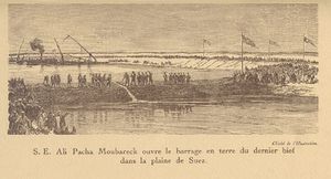 وفى 25 أبريل 1859 أقيم حفل صغير ببورسعيد للبدء فى الحفر، فكانت ضربة المعول الأولى لديليسبس، وكان معه مائة عامل حضروا من دمياط، وتوقف الحفر بسبب اعتراضات الباب العالى وإنجلترا، إلى أن بدأ مرة أخرى فى ٣٠ نوفمبر إثر وساطة قامت بها الإمبراطورة أوجينى لدى الباب العالى وإنجلترا، فعاود العمال الحفر وكان عددهم قد بلغ 330 عاملاً، و٨٠ عاملاً أجنبياً، ثم تم الاستعانة بالعمال المصريين فقط، فبلغ عددهم 1700 عامل.