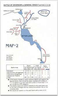 بالاضافة لذلك، فقد كـُلـِّف اللواء 14 الإسرائيلي بالاستيلاء على رأس جسر على الضفة الغربية من القناة في "المزرعة الصينية" (وقد ثبت عملياً لاحقاً خطأ ذلك) واحتلال الموقع "دبرياش מצמד" (كانت هناك تقارير متناقضة أن الموقع يضم القيادة العامة للقوات المسلحة المصرية، أو على النقيض - أن هناك قوات إسرائيلية أو أسرى إسرائيليون في ذلك الموقع. وقد ثبت أن كل تلك المعلومات غير صحيحة).