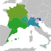 The Vulgar Latin in the region of Gallia took on a distinctly local character, some of which is attested in graffiti,[19] which evolved into the Gallo-Romance dialects which include French and its closest relatives. The influence of substrate languages may be seen in graffiti showing sound changes that matched changes that had occurred earlier in the indigenous languages, especially Gaulish.[19] The Vulgar Latin in the North of Gaul evolved into the langues d'oïl and Franco-Provencal, and the dialects in the South evolved into the modern Occitan and Catalan tongues. Other languages held to be Gallo-Romance include the Gallo-Italic languages and the Rhaeto-Romance languages. Latin epigraphy in Gaul has peculiarities such as the occasional variant ⟨Ꟶ⟩ instead of ⟨H⟩.[20]