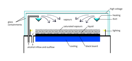 Diffusion-type cloud chambers will be discussed here. A simple cloud chamber consists of the sealed environment, a warm top plate and a cold bottom plate (See Fig. 3). It requires a source of liquid alcohol at the warm side of the chamber where the liquid evaporates, forming a vapor that cools as it falls through the gas and condenses on the cold bottom plate. Some sort of ionizing radiation is needed.