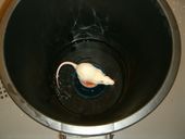 This rat is being deprived of restful REM sleep by a researcher using a single platform ("flower pot") technique. The water is within 1 cm of the small flower pot bottom platform where the rat sits. At the onset of REM sleep, the rat would either fall into the water only to clamber back to its pot to avoid drowning, or its nose would become submerged into the water shocking it back to an awakened state.