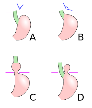 مخطط لأنواع مختلفة من لفتق الحجابي. يشير اللون الأخضر إلى المريء، والأحمر للمعدة، والأرجواني للحجاب الحاجز، والأزرق لزاوية هيس. أ هو التشريح الطبيعي، ب هو مرحلة ما قبل الفتق، ج هو الفتق الحجابي المنزلق، و د هو الفتق حول المريء (المتدحرج).