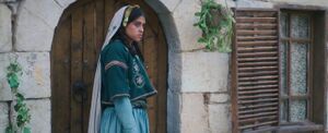 تختبيء عائلة صالح في منزل أبو فرحة بالأعلى، بينما تبقى فرحة تطل عبر شقوق باب قبو المؤن على مشهد، قبض جنود اليهود على صالح وفلسطيني آخر في ساحة منزلها بالخارج. يعثر الجنود على دم الولادة بساحة المنزل وكذا علي يدي صالح. فيتشككون بوجود أسلحة مخبأة بالمنزل. يجد المحتلون الأم وأثناء تفتيشها بساحة منزل فرحة، يسمعون صوت بكاء وليدها بالأعلى. يتصح أن المعتقل الفلسطيني مغطى الرأس، هو خائن يقوم بإدلال جنود الصهاينة على أماكن تخزين السلاح، على وعدمنهم بعدم إيذاء الفلسطينين غير المسلحين، ولا الأطفال أو النساء. لكن جنود الإحتلال تقوم بصف عائلة صالح في ساحة المنزل، وتطلق النار عليهم جميعاً، أمام عيني فرحة المطلة من بين شقوق باب بيت المونة المطل على الساحة. يصيب الخائن نوبة قيء، وبينما يحاول لم شتات نفسه بشربة ماء من زير الماء المجاور لباب بيت المونة قبل أن يغادر وراء جنود الإحتلال، يدرك أن فرحة مختبأة خلف شقوق باب القبو الموصد، فتراه وقد كشف الغطاء عن وجهه، الخائن هو أبو صديقتها فريدة.