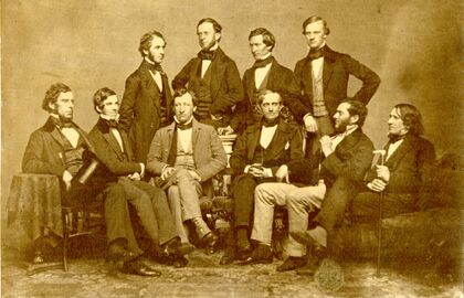 Traditionally, it is thought that the only portrait of Catherwood is in the famous Table XXIV of Views of Ancient Monuments in Central America, Chiapas and Yucatan, with a view of the temple of Tulum. The scholar Fabio Bourbon, after studies and a long reflection, has formulated a different hypothesis. It is well known that during the second expedition in Central America, Stephens and Catherwood were accompanied by a young surgeon (and ornithologist) from Boston, Samuel Cabot III, born in Boston on 20 September 1815. The Cabot family was part of the upper class in Boston. At the time of the trip, he was almost 27 years old. Years later he would become an eminent surgeon and a well known personality in Boston. Samuel III was described as a person rather slender, tall, with light hair and light eyes. There is an image taken by Oliver Wendell Holmes (1809-1894) with members of the Boston Society for Medical Improvement, around 1853. Samuel is seated, third from left. Eleven years had passed since the adventure in Yucatan, but he could very well be the person depicted by Catherwood in the table, holding a measuring tape. Catherwood, in fact, was a pragmatic man, used to documenting the reality with his pencil. Frederick presumably had no interest in representing himself, indeed he never painted his self-portrait.