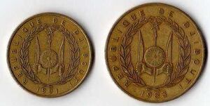 5 Francs | Coat of arms of Djibouti | Head of nile lechwe; ostrich feathers; catfish and chisel; motto; value | 1991 |