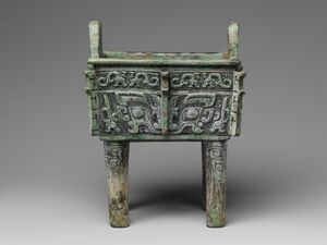 Da He ding (大禾方鼎; Dà Hé fāngdǐng); Shang dynasty; Hunan Museum. This ritual bronze is one of the very rare vessels that is decorated with human faces