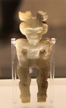 During the Zhou period, attempts at sculptures of the human form are recorded in the extant archaeology. Among the very few such depictions known in China before that date: four wooden figurines[8] from Liangdaicun (梁帶村) in Hancheng (韓城), Shaanxi, possibly dating to the 9th century BCE; two wooden human figurines of foreigners possibly representing sedan chair bearers from a Qin state tomb in Longxian (隴縣), Shaanxi, from about 700 BCE; and more numerous statuettes from around 5th century bronze musicians in a miniature house from Shaoxing (紹興) in Zhejiang; a 4th-century human-shaped lamp stand from Pingshan (平山) county royal tomb, Hebei. The Taerpo horserider is a Zhou-era Warrior-State Qin terracotta figurine from a tomb in the Taerpo cemetery (塔兒坡墓) near Xianyang in Shaanxi, dated to the 4th–3rd century BCE. Another nearly-identical statuette is known, from the same tomb. Small holes in his hands suggest that he was originally holding reins in one hand, and a weapon in the other.[9] This is the earliest known representation of a cavalryman in China.[9]