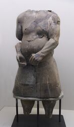 Terracotta statuettes had been known for a long time in China, but there are no known examples of monumental stone statuary before the stone sculptures at the Mausoleum of Huo Qubing (140–117 BCE), a general of Emperor Han Wudi who went to the western regions to fight the Xiongnu.[17] In literary sources, there is only a single 3rd–4th century CE record of a possible earlier example: two alleged monumental stone statues of qilin (Chinese unicorns) said have been set up on top of the tomb of the First Emperor Qin Shihuang.[18] The most famous of Huo Qubing's statues is that of a horse trampling a Xiongnu warrior.[17]