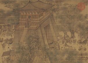 The Han dynasty was known for jade burial suits. One of the earliest known depictions of a landscape in Chinese art comes from a pair of hollow-tile door panels from a Western Han dynasty tomb near Zhengzhou, dated 60 BCE.[14] A scene of continuous depth recession is conveyed by the zigzag of lines representing roads and garden walls, giving the impression that one is looking down from the top of a hill.[14] This artistic landscape scene was made by the repeated impression of standard stamps on the clay while it was still soft and not yet fired.[14] However, the oldest known landscape art scene tradition in the classical sense of painting is a work by Zhan Ziqian of the Sui dynasty (581–618).