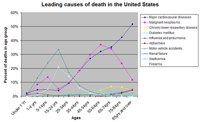 Leading causes of death in the United States by age group.[3] Leading causes of death in the United States, as percentage of deaths in each age group.[3] Perinatal mortality (<1yrs of age) seldom falls into any of these causes. |
