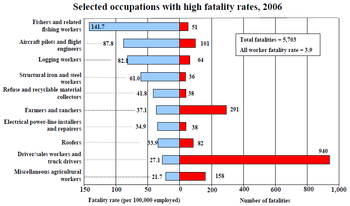 Number and rate of fatal occupational injuries, by industry sector, 2006 in the United States.[4] Selected occupations with high fatality rates, 2006, in the United States.[4] |