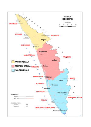 The state comprises three parts – the Northern Kerala districts of Kasaragod, Kannur, Wayanad, Kozhikode, Malappuram; the Central Kerala districts of Palakkad, Thrissur, Ernakulam, Idukki, Kottayam; and the Southern Kerala districts of Alappuzha, Pathanamthitta, Kollam, and Thiruvananthapuram.[3] Such a regional division occurred being part of historical regions of Cochin, North Malabar, South Malabar, and Travancore.[4] North Malabar region includes Kasargod, Kannur, Wayanad, and the northern region of Kozhikode district, south Malabar region includes south-central part of Kozhikode district, Malappuram, parts except Chittoor taluk of Palakkad district, Kunnamkulam and Chavakkad region of Thrissur district. The regions of South Malabar and Kingdom of Cochin, both of which share many historical, geographical, and cultural similarities, together constitute the districts of Central Kerala.[4][5] The Travancore region is incorporated in the districts of South Kerala.[6] The Travancore region was again divided into three zones as Northern Travancore (Hill Range) (Idukki District, Kottayam district and eastern portion of Ernakulam district), Central Travancore (Central Range) (Kollam district, Pathanamthitta and Alappuzha district) and Southern Travancore (Southern Range) (Thiruvananthapuram).[7]