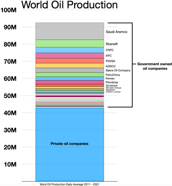 Under this definition (crude and condensate), total world oil production in 2023 averaged 81,804,000 barrels per day. Approximately 72% of world oil production came from the top ten countries, and an overlapping 35% came from the twelve current OPEC members. Members of OPEC+, which includes current OPEC members produce about 60% of the world's petroleum.