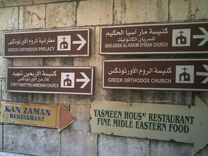لافتات شوارع ثنائية اللغة تشير إلى مواقع الكنائس في حي الجديدة التاريخي بحلب.