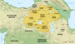 Little is known of the early history of Kars beyond the fact that, during medieval times, it had its own dynasty of Armenian rulers and was the capital of a region known as Vanand. Medieval Armenian historians referred to the city by a variety of names, including Karuts’ k’aghak’ ('Kars city'), Karuts’ berd, Amrots’n Karuts’, Amurn Karuts’ (all meaning 'Kars Fortress').[3] At some point in the ninth century (at least by 888) it entered into the domains of the Armenian Bagratunis. Kars was the capital of the Bagratid kingdom of Armenia between 929 and 961.[12] During this period, the town's cathedral, later known as the Church of the Holy Apostles, was built.[13]