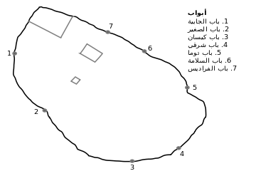 | باب الفرج (en) • باب الصغير • باب الجابية • باب كيسان • باب شرقي • باب توما • باب السلام • باب الفراديس |