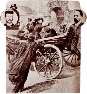 The Lisbon Regicide as depicted in the French Le Petit Journal, incorrectly showing four assassins rather than two (February 1908) | |