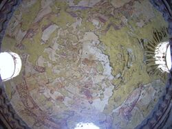 The building is actually the remnant of a larger complex that included an actual castle, meant as a royal retreat, without any military function, of which only the foundation remains. What stands today is a small country cabin. It is most notable for the frescoes that remain mainly on the ceilings inside, which depict, among others, a group of rulers, hunting scenes, dancing scenes containing naked women, working craftsmen, the recently discovered "cycle of Jonah", and, above one bath chamber, the first known representation of heaven on a hemispherical surface, where the mirror-image of the constellations is accompanied by the figures of the zodiac. This has led to the designation of Qusayr 'Amra as a UNESCO World Heritage Site.[2][3][4][1][5][6] The bathhouse is also, along with examples in the other desert castles of Jordan, one of the oldest surviving remains of a hammam in the historic Muslim world.[7][8][9]