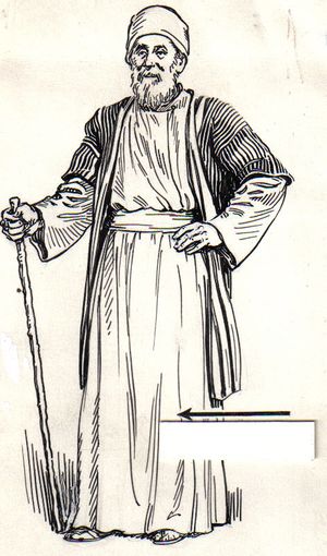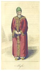 The kaftan has been historically documented to have been worn in Algeria in the beginning of the 16th century and the presence of the kaftan in Algeria dates far back to the Rustamid period[27] and is attested during the Zirid period in the 10th century as well as the Zayyanid period.[28][29] Following the Ottoman tradition, the male kaftan, known as the kaftan of honour, was bestowed by the Ottoman Sultan upon the governors of Algiers who, in turn, bestowed kaftans upon the Beys and members of distinguished families.[30][31] In his Topography and General History of Algiers, Antonio de Sosa described it as a coloured robe made of satin, of damask, of velvet and silk and having a form that reminded him of the priests' cassocks.[32] The Dey wore the kaftan with dangling sleeves; the khodjas (secretaries) wore a very long cloth based kaftan, falling to the ankles; the chaouchs (executors of the justice of the dey) were recognized by a green kaftan with sleeves either open or closed, according to their rank. The kaftan was also worn by the janissaries in the 17th and part of the 18th century.[32] It continued to be worn by male dignitaries well into the 20th century.[32]