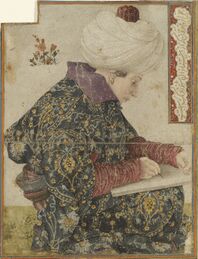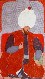 The tiles in the Kubadabad Palace depict Turkish figures dressed in kaftans.[15] The palace was built for Sultan Aladdin Kayqubad I who ruled from 1220 to 1237. Furthermore, typical Seljuk depictions from the 11th to the 13th century depict figures dressed in Turkish style kaftans.[16] The kaftan was also worn by the Anatolian Seljuks who had even gifted kaftans to the first Ottoman Sultan, Osman I.[17][18] In connection with the inheritance of Osman I, the historian Neşri described a kaftan in the list of inherited items: "There was a short-sleeved kaftan of Denizli cloth".[19]