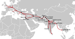 In the 830s, Byzantine Emperor Theophilus, who fought the Abbasids on the battlefield and built a Baghdad-style palace near the Bosporus, went about in kaftans and turbans. Even as far as the streets of Ghuangzhou during the era of Tang dynasty, the Abbasid kaftan was in fashion.[3]