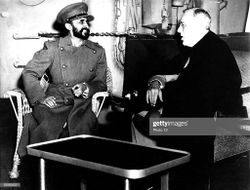 | اللقاء الأول بين الملك عبد العزيز والرئيس الأمريكي فرانكلن روزڤلت، 14 فبراير 1945، على متن السفينة كوينسي. |
