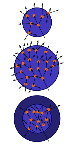 Top: A sphere of fissile material is too small to allow the chain reaction to become self-sustaining as neutrons generated by fissions can too easily escape.