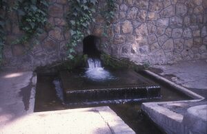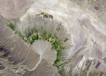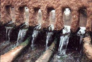 A qanat or kārīz is a system for transporting water from an aquifer or water well to the surface, through an underground aqueduct; the system originated approximately 3,000 years ago in what is now Iran.[1] The function is essentially the same across North Africa and the Middle East but the system operates under a variety of regional names: qanat or kārīz in Iran, foggara in Algeria, khettara in Morocco, falaj in Oman, karez in Afghanistan, auyoun in Saudi Arabia, et al.[1] The largest extant and functional qanat systems are located in Iran, Afghanistan, Oman, the oases of Turfan region of China, Algeria, and Pakistan.[1]