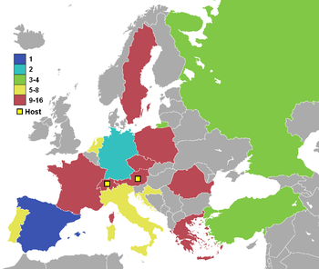 | فرنسا 1960 | إسبانيا 1964 | إيطاليا 1968 | بلغاريا 1972 | يوغسلافيا 1976 | إيطاليا 1980 | فرنسا 1984 | ألمانيا الغربية 1988 | السويد 1992 | إنجلترا 1996 | بلغاريا/هولندا 2000 | البرتغال 2004 | النمسا/سويسرا 2008 |