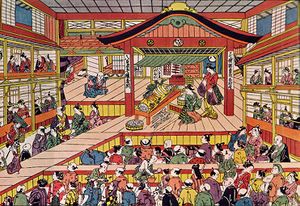 Shibai Ukie ("A Scene from A Play") by Masanobu Okumura (1686–1764), depicting Edo Ichimura-za theater in the early 1740s