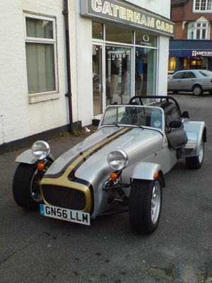 Caterham Cars is a British manufacturer of specialist lightweight sports cars established in Caterham, Surrey, with their headquarters in Crawley, Sussex. Their current model, the Caterham 7 (or Seven), originally launched in 1973, is a direct evolution of the Series 3 Lotus Seven designed by Colin Chapman. In the 1990s the company made the Caterham 21, a two-seater soft top alternative to the MGF and Lotus Elise, (which both sold many more units). A track-only car, the SP/300.R, a joint project with Lola was released for customer testing in 2010 and was scheduled for release in 2013. On 27 April 2011, Team Lotus owner Tony Fernandes announced that he had purchased Caterham.[1][2]