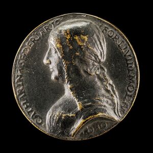 While her role as a ruler was considered to be masculine, Caterina had series of portrait medals that embodied her diplomatic skills and political power as a successful regent. At the time, portrait medals were important among the noble society and could be distributed and exchanged as a way to communicate self-presentation, characteristic, and accomplishments of that person. Caterina's first medal represented her beauty, womanly virtue, and conformity to the female role as a noble wife and mother. When Girolamo died, Caterina's next medal represented loyalty and protection of her family with her new position as a chaste widow. While it was feminine, it was also clearly masculine because it represented her additional powerful position as a regent.[2]