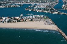 كاسر الأمواج يخلق موانئ أكثر أمناً، إلا أنه قد يحتجز أيضاً الرواسب التي تتحرك بطول الساحل. شبه جزيرة بالبوا في نيوپورت بيتش، كاليفورنيا، أبريل، 1998.