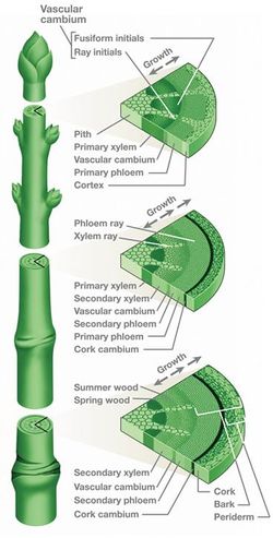 كامبيوم Cambium ، الطبقة الداخلية في لحاء خشب الأشجار، وتمثل مكان النمو في النبات.[2] وتعطي provides partially undifferentiated cells for plant growth. It is found in the area between xylem and phloem. A cambium can also be defined as a cellular plant tissue from which phloem, xylem, or cork grows by division, resulting (in woody plants) in secondary thickening. It forms parallel rows of cells, which result in secondary tissues.[3]