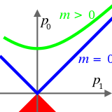 In particle physics, the invariant mass m0 is equal to the mass in the rest frame of the particle, and can be calculated by the particle's energy E and its momentum p as measured in any frame, by the energy–momentum relation: