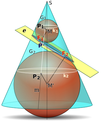 - A line passing through P and the vertex S of the cone intersects the two circles, touching G1 and G2 respectively at points P1 and P2.