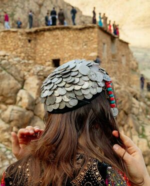Hawraman female with traditional headdress decorated by coins