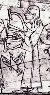 [In New Grove Dictionary of Musical Instruments, this is the caption accompanying the image:] Kinnor played before a king: ivory plaque (1350-1150 BC) from Megiddo (Archaeological Museum, Jerusalem.