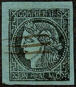 Corrientes is legendary in the world of philately for the postage stamps it issued from 1856 to 1880. These are among the very early or "classic" postage stamps of the world (the first, from Great Britain, were issued in 1840; those by the United States in 1847). The Corrientes stamps were close copies of the first issue of stamps from France, which depicted the profile head of Ceres, the Roman goddess of agriculture, and were individually crudely engraved by hand, so that each die is noticeably different, and were printed in small sheets. The first issues, from 1856 to 1860, bore the denomination in the lower panel; in 1860, the value panel was erased; the different denominations thereafter being indicated by the color of the paper used. As locally produced "primitives", the early Corrientes stamps have long been prized by collectors. After 1880, stamps of Argentina were used.[4]