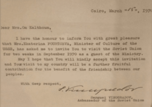 في حديث إلى ڤلاديمير بوبوڤ، نائب وزير الثقافة السوڤيتي آنذاك، قالت أم كلثوم: منذ الدقائق الأولى لاقامتي في الاتحاد السوفياتي خرجت بأجمل الانطباعات، فلم أشهد مثل هذا المستوى العالمي للتنمية الفنية في أي بلد آخر من بلدان العالم، وإنني سعيدة بتلك الفرصة التي مكنتني من التعرف بنفسي إلى فن الغناء للشعب السوفياتي.